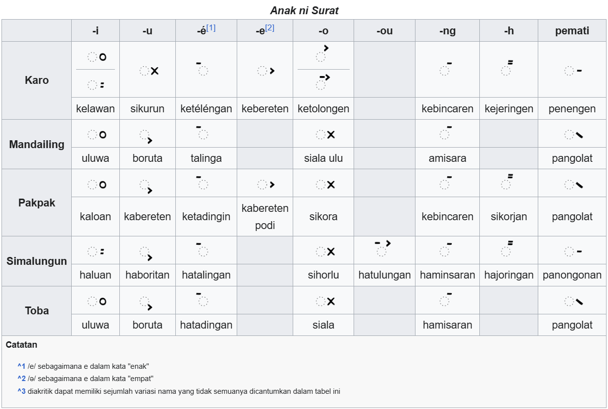 Diakritik (anak ni surat) adalah tanda yang melekat pada aksara utama untuk mengubah vokal inheren aksara utama yang bersangkutan, bentuknya dapat dilihat sebagaimana berikut: