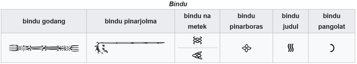 Teks tradisional Batak ditulis tanpa spasi antarkata (scriptio continua) dan normalnya tidak menggunakan tanda baca. Namun begitu, tanda baca bernama bindu kadang digunakan pada teks tertentu. Tanda baca ini sering kali bersifat dekoratif dan memiliki banyak variasi bentuk. Bindu godang umumnya digunakan untuk menandakan awal teks pada naskah pustaha, sementara bindu pinarjolma digunakan untuk menunjukan awal teks pada naskah bambu. Bindu na metek dan pinarboras digunakan untuk memisahkan antarbab atau bagian-bagian tertentu teks. Bindu judul kadang digunakan untuk memisahkan antara judul dan isi teks dalam satu baris kalimat. Bindu pangolat kadang digunakan menandakan disambiguasi pada kata atau istilah tertentu.
