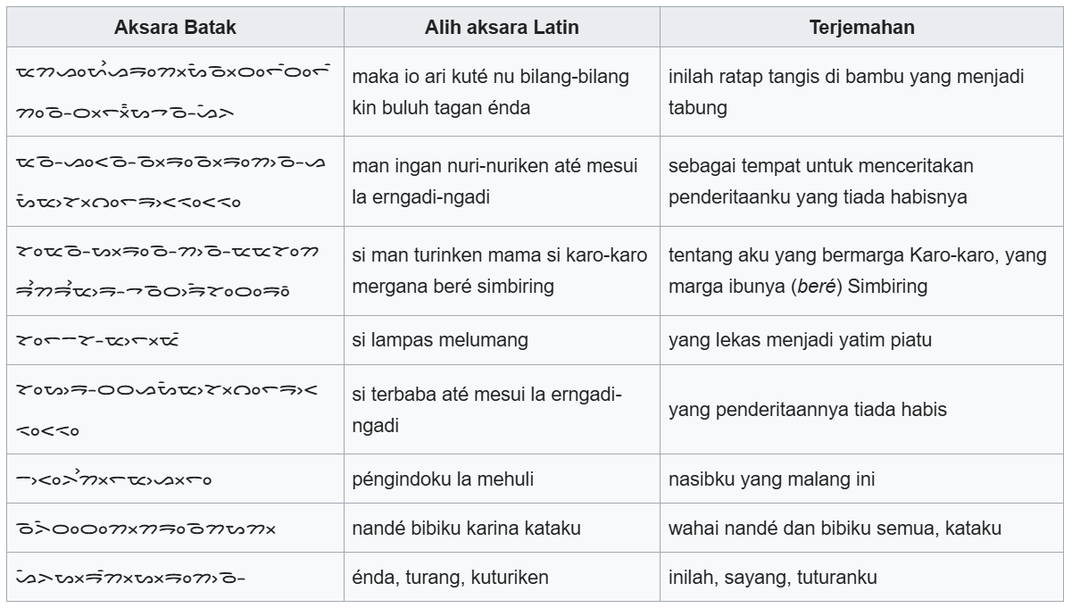 Berikut adalah sebuah ratapan Batak Karo pada bambu dari koleksi Museum fur Völkerkunde Berlin no. IC 39908a. Alih aksara dan terjemahan disadur dari Kozok (1999):