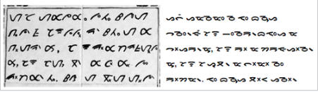 Contoh penulisan surat Batak kontemporer yang terdistorsi (kiri) dalam Kamus Besar Bahasa Indonesia edisi III yang dicetak pada tahun 2002, dibandingkan dengan penulisan berdasarkan naskah Batak otentik (kanan). Selain bentuk hurufnya yang sangat terdistorsi, contoh kiri juga memiliki sejumlah kesalahan ortografis yang tidak pernah terjadi dalam naskah Batak asli.