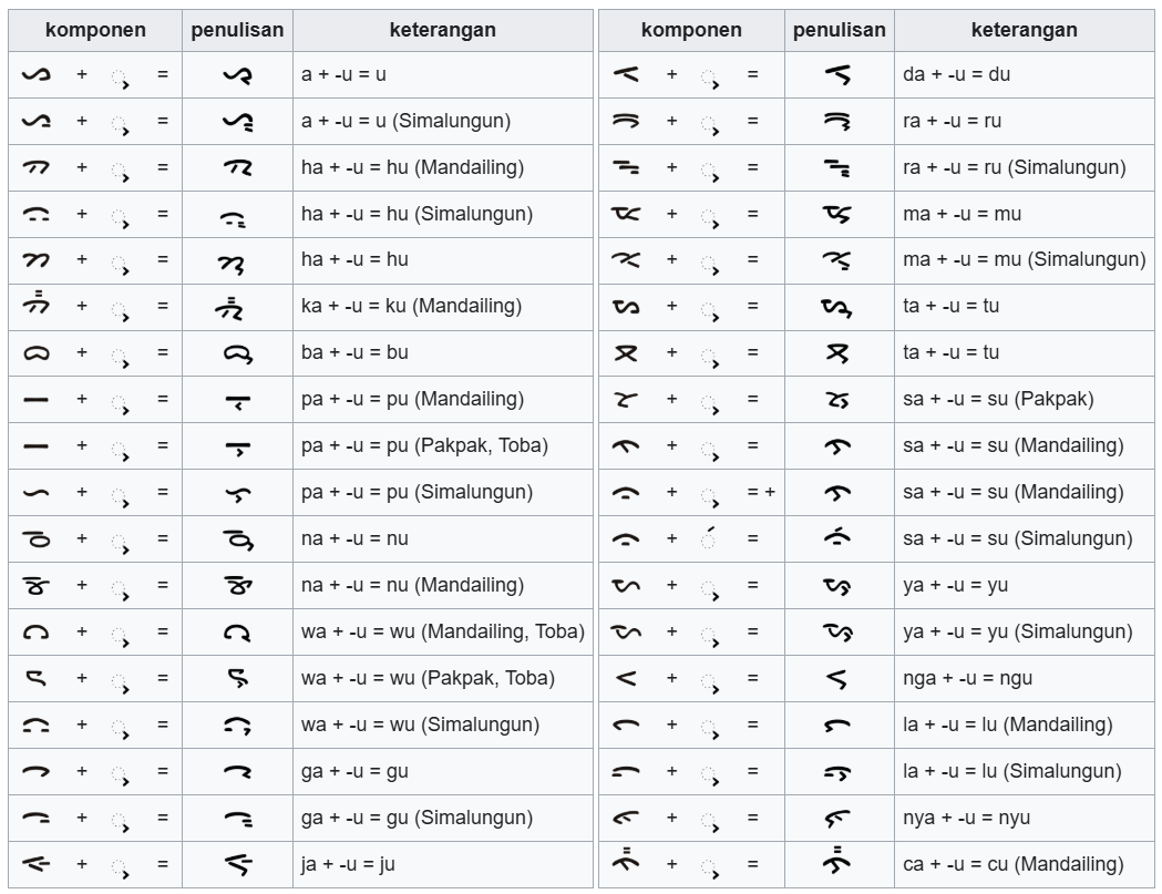Dalam penulisan Mandailing, Pakpak, Simalungun, dan Toba, diaktirik -u sering kali ditulis bersambung sehingga membentuk ligatur dengan aksara dasar bersangkutan. Ligatur tersebut dapat dilihat sebagaimana berikut: