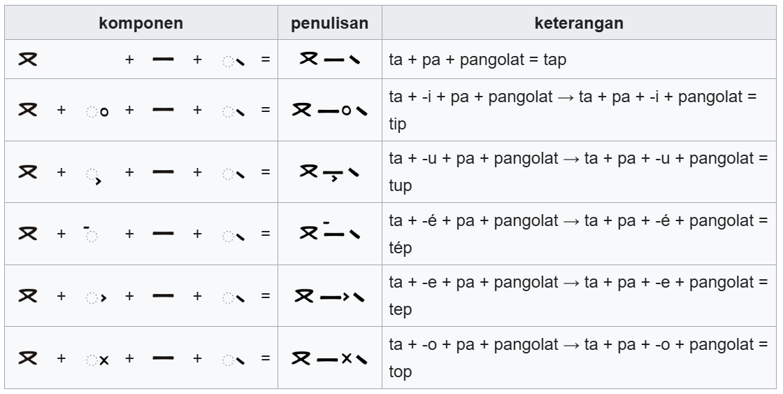 Pada penulisan suku kata tertutup yang berpola konsonan-vokal-konsonan, diakritik vokal yang normalnya menempel pada aksara dasar pertama ditempatkan ulang agar menempel dengan aksara dasar kedua dan diaktrik pemati. Aturan ini berlaku untuk semua varian aksara Batak, dan penerapannya (menggunakan contoh varian Batak Karo) dapat dilihat sebagaimana berikut: